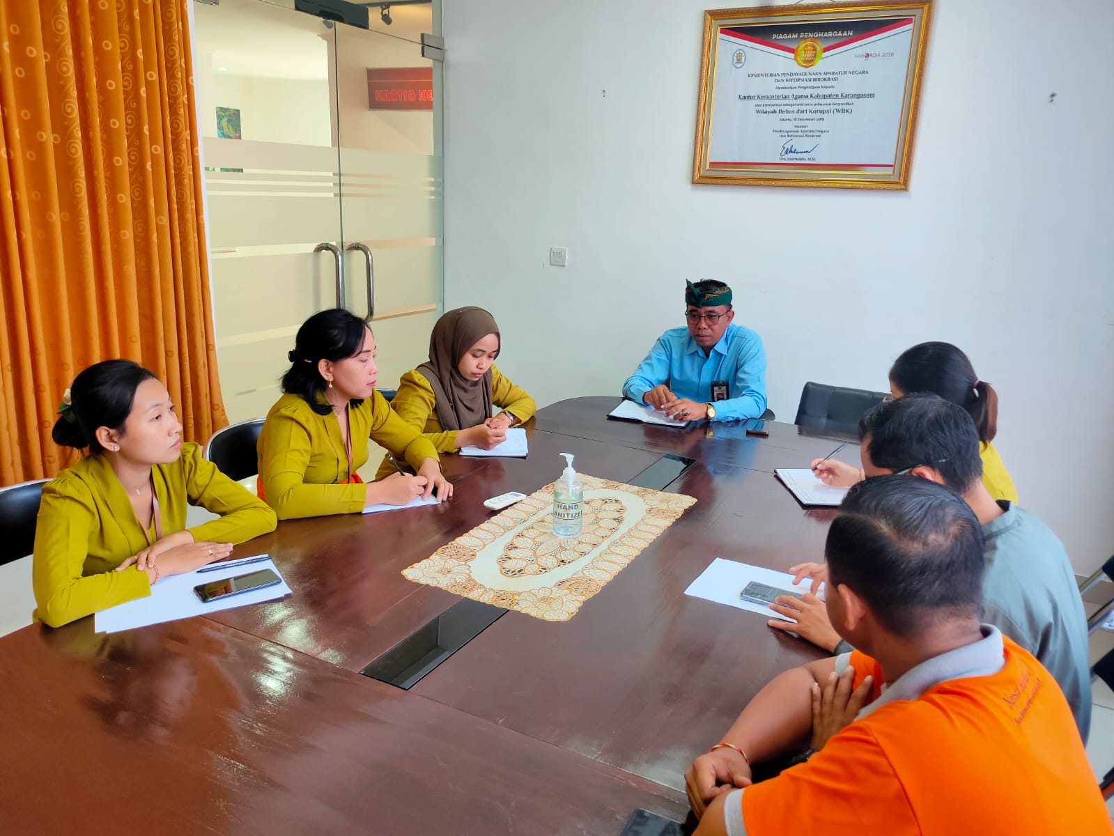 Kemenag Karangasem melalui Kasubbag Tata Usaha melaksanakan dialog dan koordinasi terkait dengan evaluasi dalam peningkatan pelayanan prima pada Kantor Kementerian Agama Karangasem. Dalam rapat ini menghadirkan para garda terdepan yang akan langsung menerima dalam pelaksanaan pelayanan yakni Satpam , Petugas Pelayanan Terpadu Satu Pintu ( PTSP ) dan juga Humas pada Kemenag Karangasem.