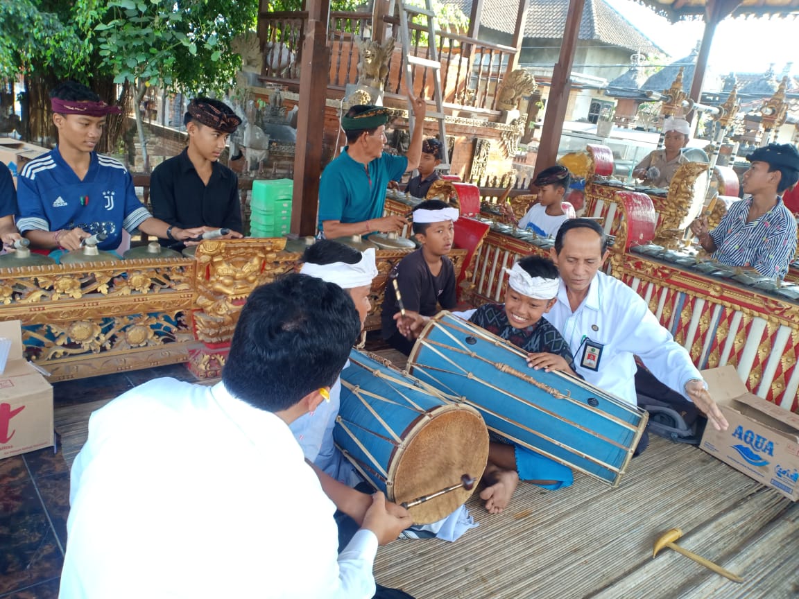 Penyuluh Agama Hindu Kantor Kementerian Agama Kabupaten Karangasem, Drs. I Nyoman Pasek, I Gusti Ayu Ratih Damayanti, S.Ag, I Nyoman Tirtayasa, S.Sos.H, Dewa Ngakan Gede Hardi Putra,S.Fil, I Wayan Sulatra, S.Ag dan I Wayan Yudi Laksana, S.Sn menjalankan tugas sebagai narasumber pelatih gamelan di Desa Adat Asak, Desa Pertima, Kecamatan Karangasem, Kabupaten Karangasem.
